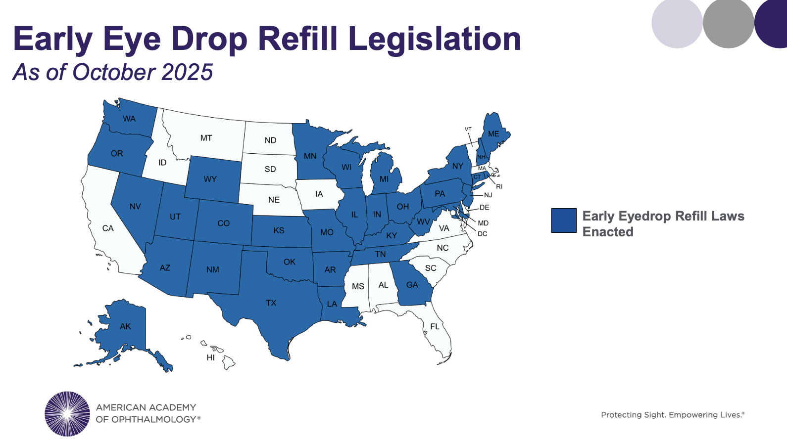 As of October 2025, more than 30 states have enacted early eye drop refill laws, shown in the AAO’s national map.
